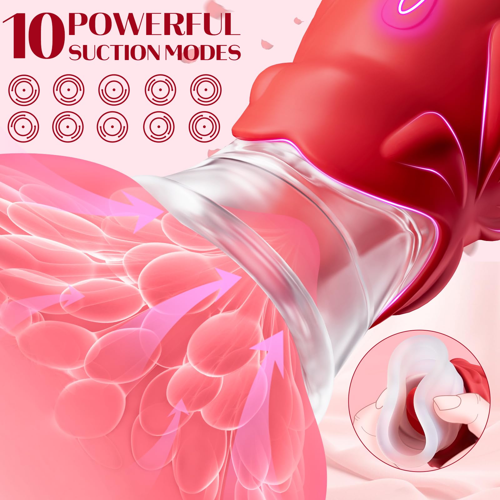 This 2 in 1 rose sex toys feature a unique function that allows you to turn on sucking and licking modes at the same time, so you can enjoy double stimulation at once. The suction cups of this sex toy vibrator are made of silicone and unlike other hard suction cups, the suction cups on this rose sex toy are soft. It can deform the suction depending on the mode selected.
